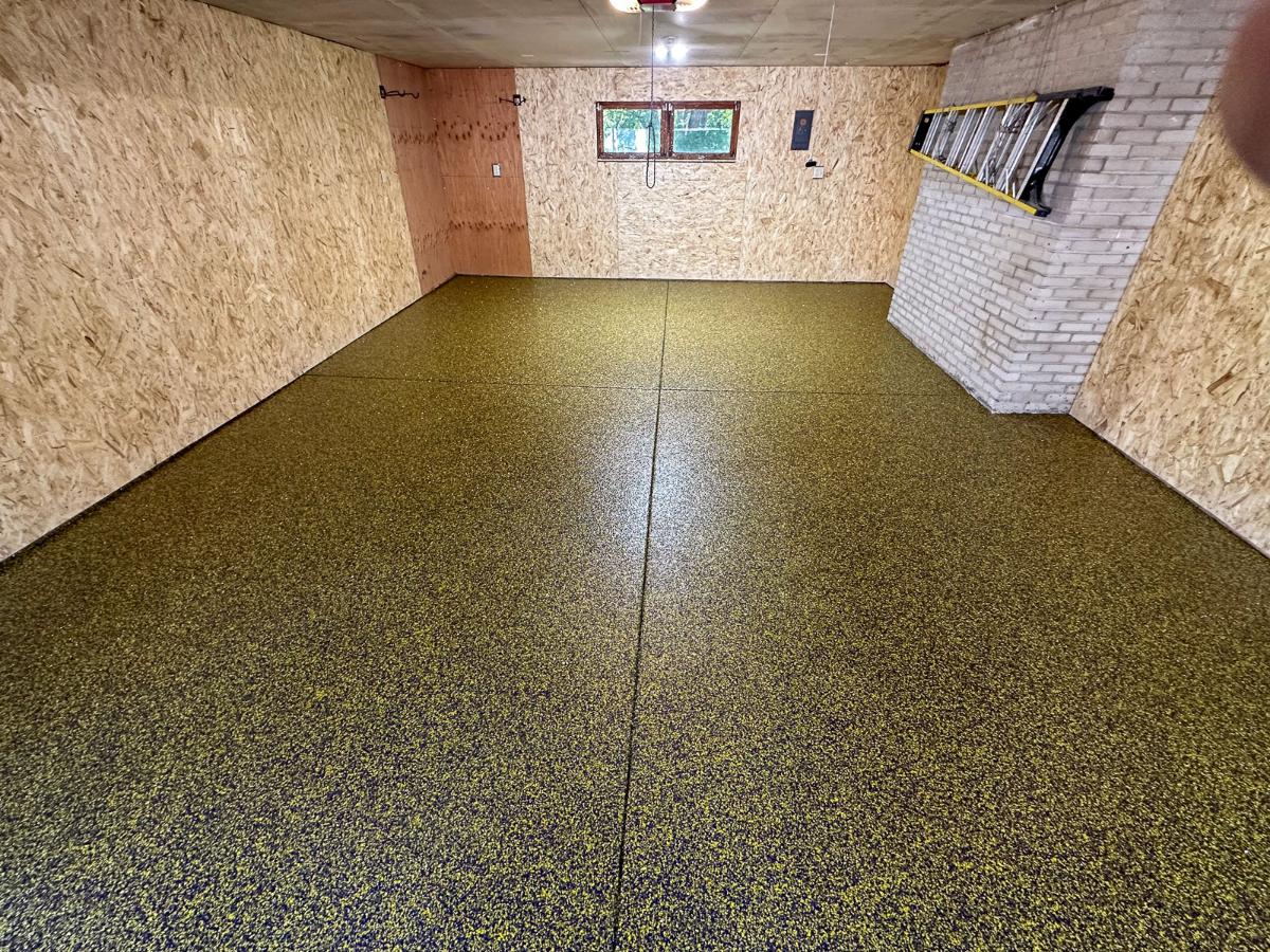 Once the floor was sound and ready for transformation, we rolled out a durable polyurea basecoat. This basecoat serves as an essential foundation, offering superior adhesion and flexibility. As part of our commitment to creating a truly unique space, we broadcasted a custom Vikings-themed flake blend featuring purple, yellow, white, and gold. The transformation was instant and visually stunning. What had been a tired, dingy garage suddenly turned into a bright, bold space worthy of a true fan. The flakes not only add aesthetic appeal but also provide texture, making the surface slip-resistant, which is particularly valuable during Minnesota’s snowy winters. This slip-resistant feature ensures safety for family and friends who may be entering and exiting the garage, especially after a winter storm when the floors can become treacherous.